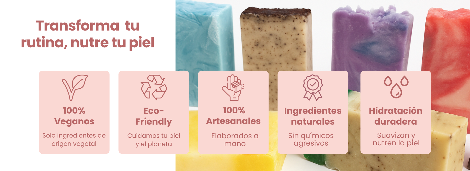 Totalmente naturales. Nuestros jabones no contienen sulfatos, parabenos ni colorantes artificiales. Solo aceites vegetales, extractos botánicos y activos naturales como la rosa mosqueta, el coco o el limón.